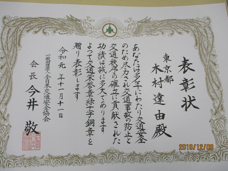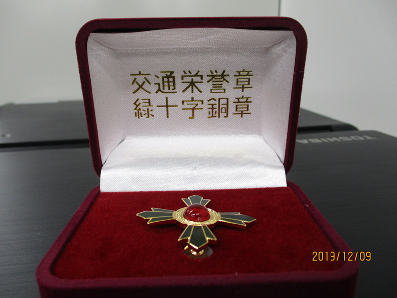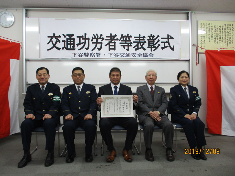 12月9日、下谷警察暑で行われた令和元年秋の交通功労者等表彰式にて、当社東京事業所所長が「交通栄誉章 緑十字銅賞」の表彰を受けました。
