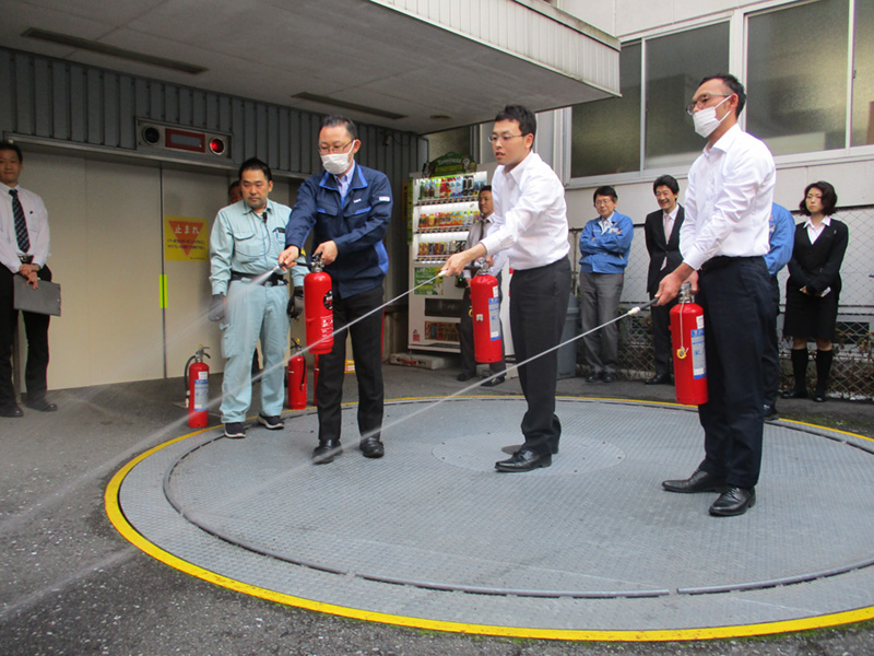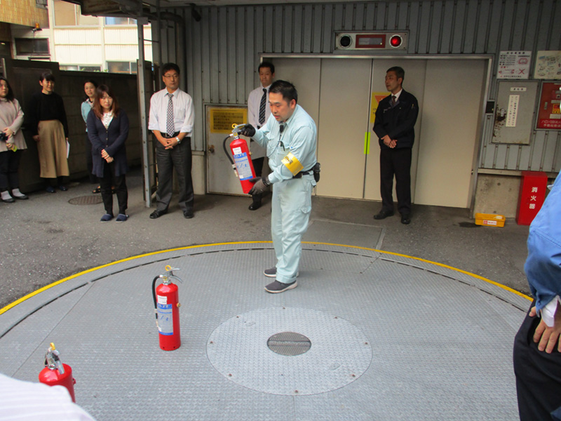 今回は地震による火災を想定し、火災発生時の避難経路の確認、消火器の使用訓練を実施しました。