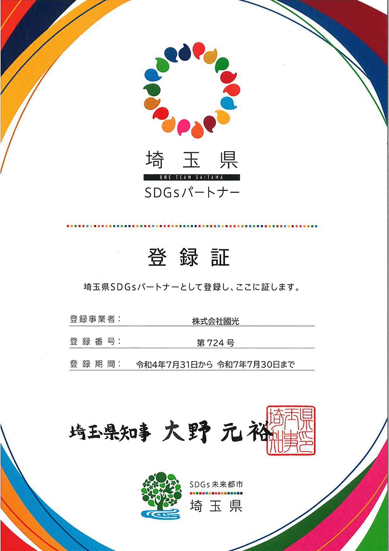 7月31日に「埼玉県SDGsパートナー企業(第6期)」として認定登録されました。「埼玉県SDGsパートナー」は、SDGsに自ら取り組むとともに、その実施内容を公表する県内企業・団体等を県が登録する制度です。埼玉県内に所在する熊谷事業所・(株)WELLが認定されました。今後も弊社ではSDGsの17のゴールに取り組んでまいります。