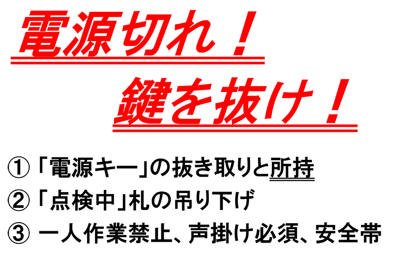 「一人作業禁止」「点検修理時の電源OFF・鍵抜きの徹底」等の啓発をして安心・安全な作業環境を構築していきます。