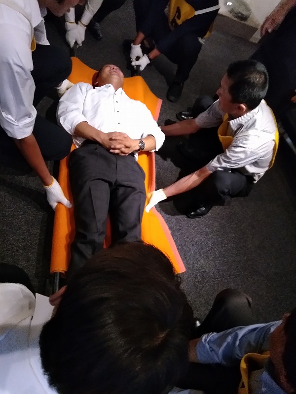 インストラクターによる説明の他、地震、消火、煙、そして救急体験を行ないました。