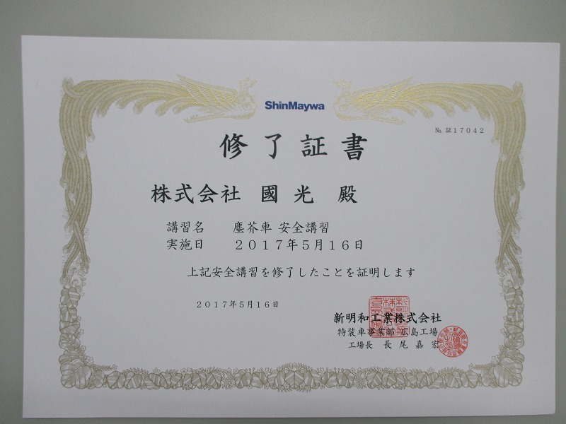 5月16日、塵芥車(パッカー車)安全講習の講習を受け、修了証書をいただきました。