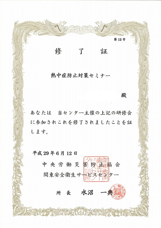 今回は「熱中症防止対策セミナー(中央労働災害防止協会主催)」を受講しました(國光13名/全体約40名)。