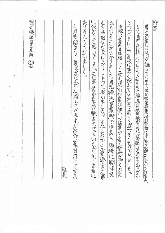 職場体験学習へいらした時の感想文を頂いておりますので、ご紹介させていただきました。